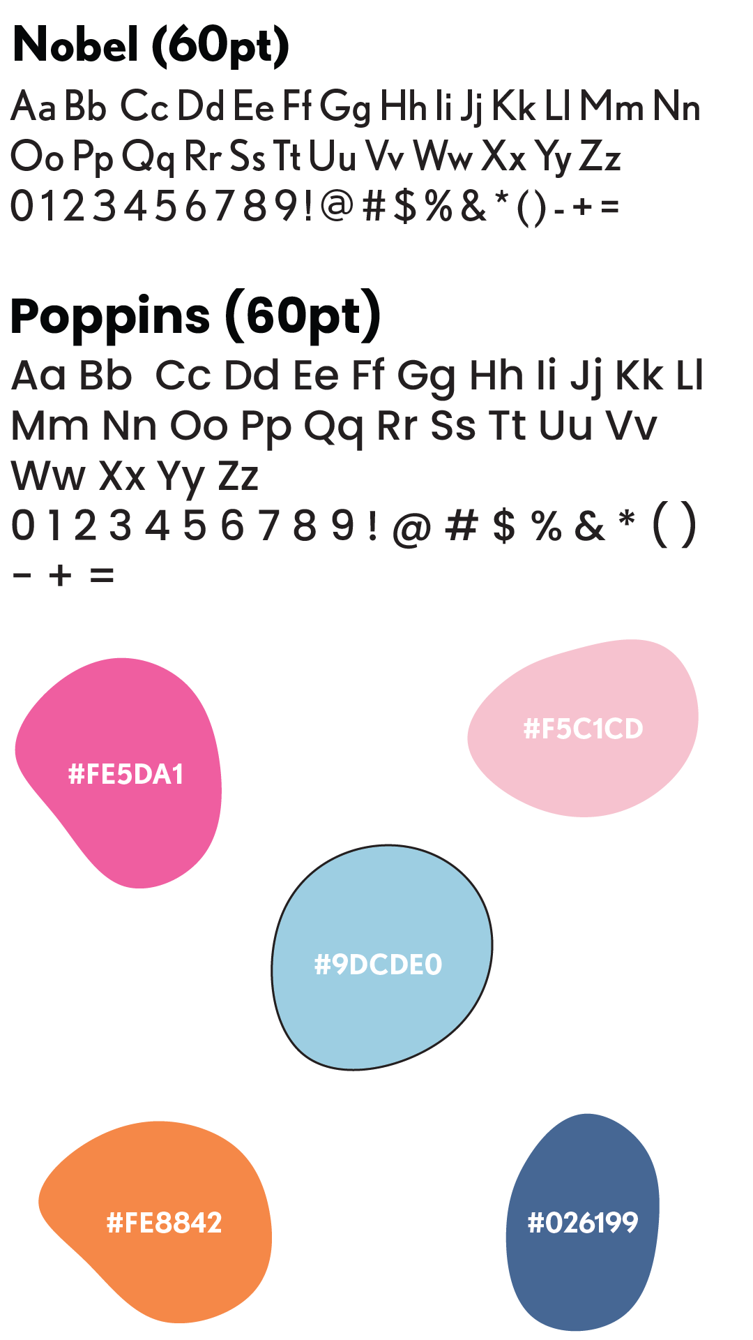 Het lettertype dat ik gebruikt op mijn visitekaartje en in mijn logo is Nobel. Op mijn visitekaartje heb ik het lettertype Nobel gebruikt omdat hier maar een korte tekst op staat. De vorm ‘regular’ van dit lettertype is net iets dikker gedrukt waardoor ik dit voor de korte tekst op het visitekaartje net wat duidelijker vond. Voor op de website heb ik het lettertype Poppins gebruikt omdat ik dit lettertype net iets fijner te lezen vindt voor wat langere teksten. Verder hebben de twee lettertypes redelijk wat overeenkomsten. Ze zijn beide sans serif en hebben een wat zachtere uitstraling dan een lettertype als Arial.