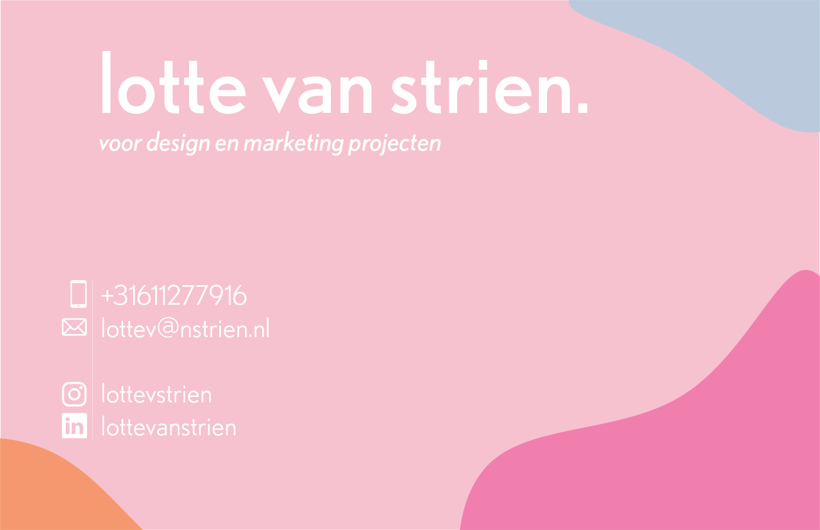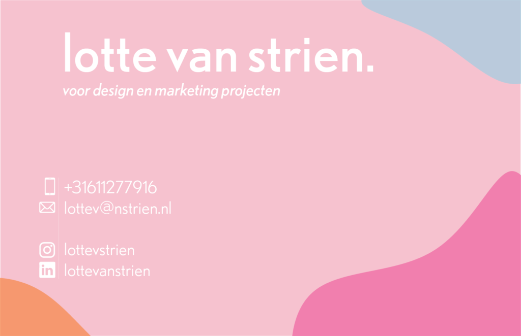 Wat ik wil uitstralen als grafisch ontwerper is gezelligheid en laagdrempeligheid. Ik heb dit geprobeerd te doen door vrolijke kleuren te gebruiken. Waar ik de inspiratie voor mijn huisstijl vandaan heb, valt uitgebreid te lezen op de pagina Inspiratie. Hier zal ik alleen een korte toelichting geven bij mijn huisstijl.